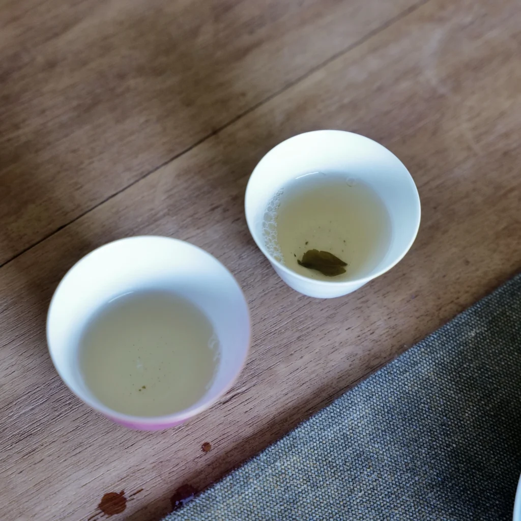 วันนั้นมีสี่คนรวมวง ผมชงเอง ใช้ชา 7 กรัม กับก้ายหวาน 130 ml แล้วเริ่มตั้งแต่ขั้นแรกสุดที่ผมให้ความสำคัญมาก ๆ คือ “ดมใบชา” เพราะใบชาไม่เคยโกหก ตั้งแต่ยังไม่ลงน้ำ ผมดมแล้วก็รู้เลยว่าชาของน้อง “กลิ่นบาง” บางแบบที่ต่อให้ชื่อจะถูก ต่อให้แหล่งจะใช่ แต่มันไม่มีแรงของใบ ไม่มีความเข้มของตัวตน